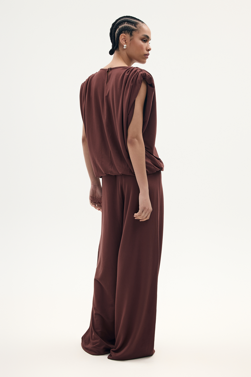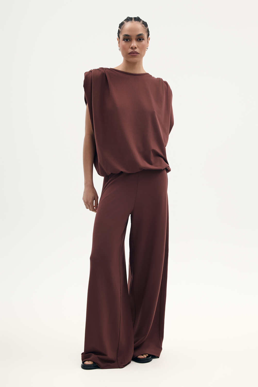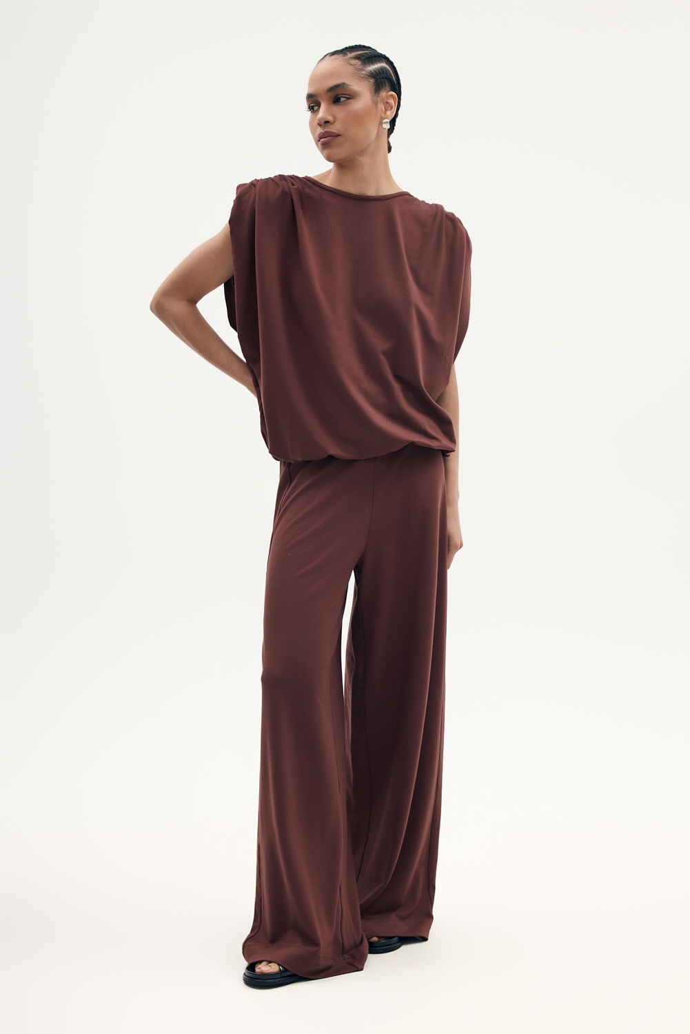 Bluzka z dzianiny bambusowej w pięknym brązowym kolorze o lużnym kroju, z mocno zarysowanymi ramionami, poduszki i marszczenia na ramionach
