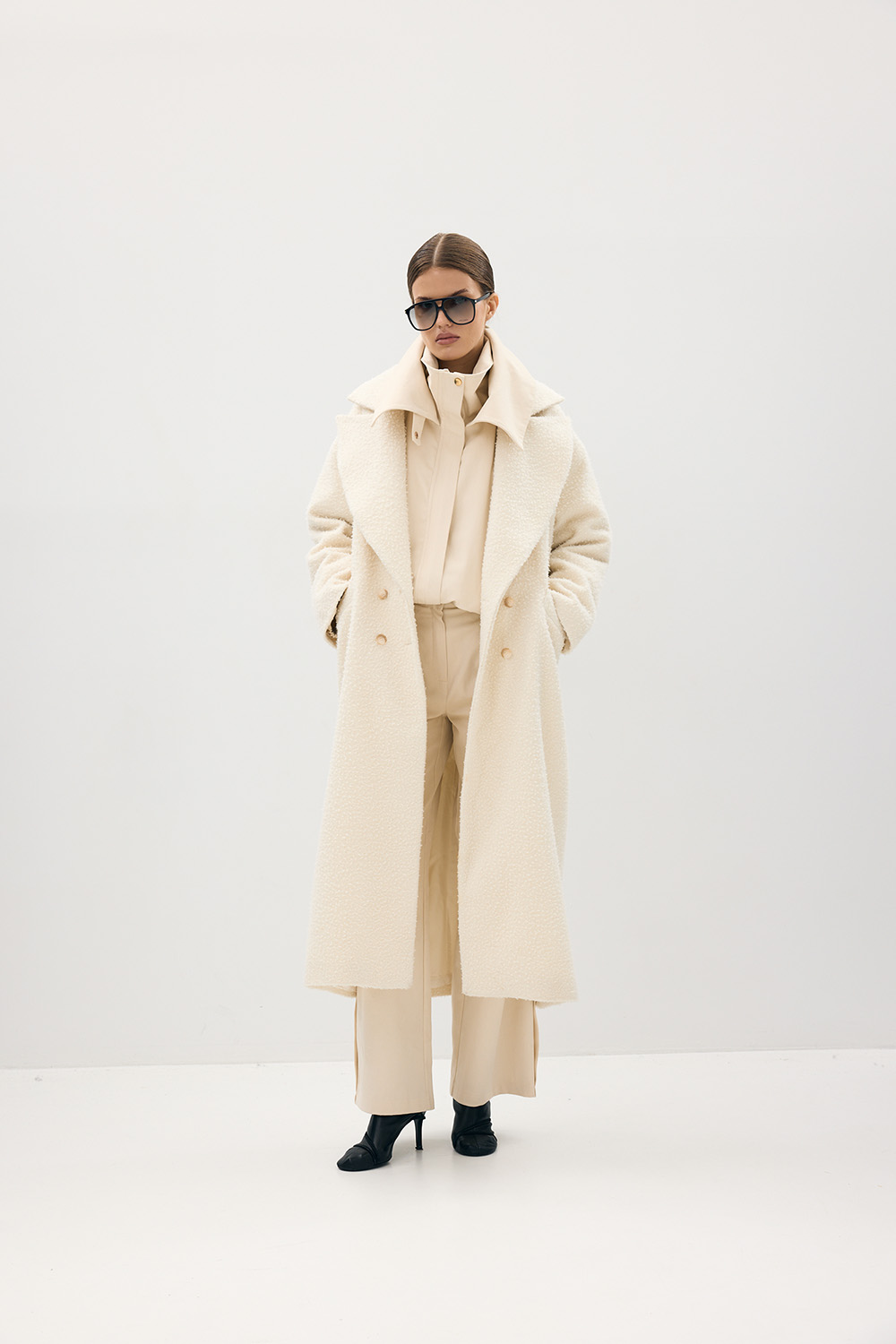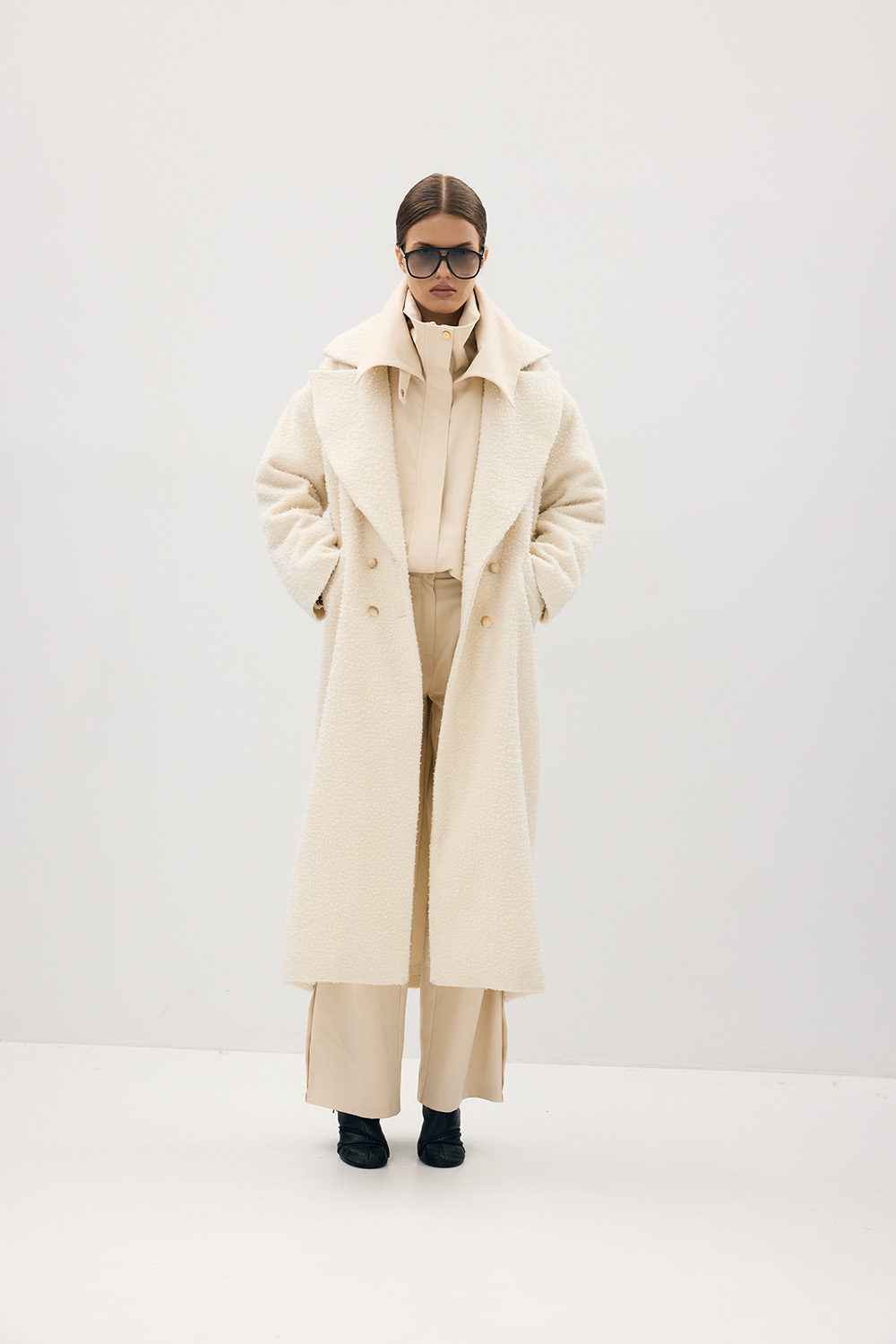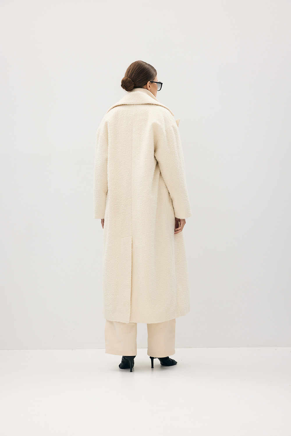 Długi płaszcz w odcieniu écru, wykonany z luksusowej włoskiej wełny Casentino, znanej z wyjątkowej struktury o miękkim, lekko pętelkowym wykończeniu. Tkanina, o korzeniach sięgających Toskanii, łączy szlachetne ciepło i wyrafinowaną fakturę, tworząc formę o ponadczasowym charakterze. Luźny, wydłużony krój z szerokimi klapami i dyskretnym zapięciem podkreśla architektoniczną prostotę projektu. Coat Casentino Écru to kwintesencja elegancji ILO PRIVE — otulający, minimalistyczny, wykonany z najwyższą precyzją i troską o detal.