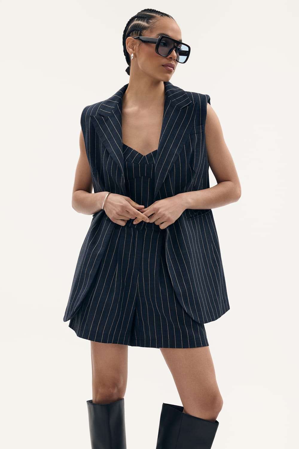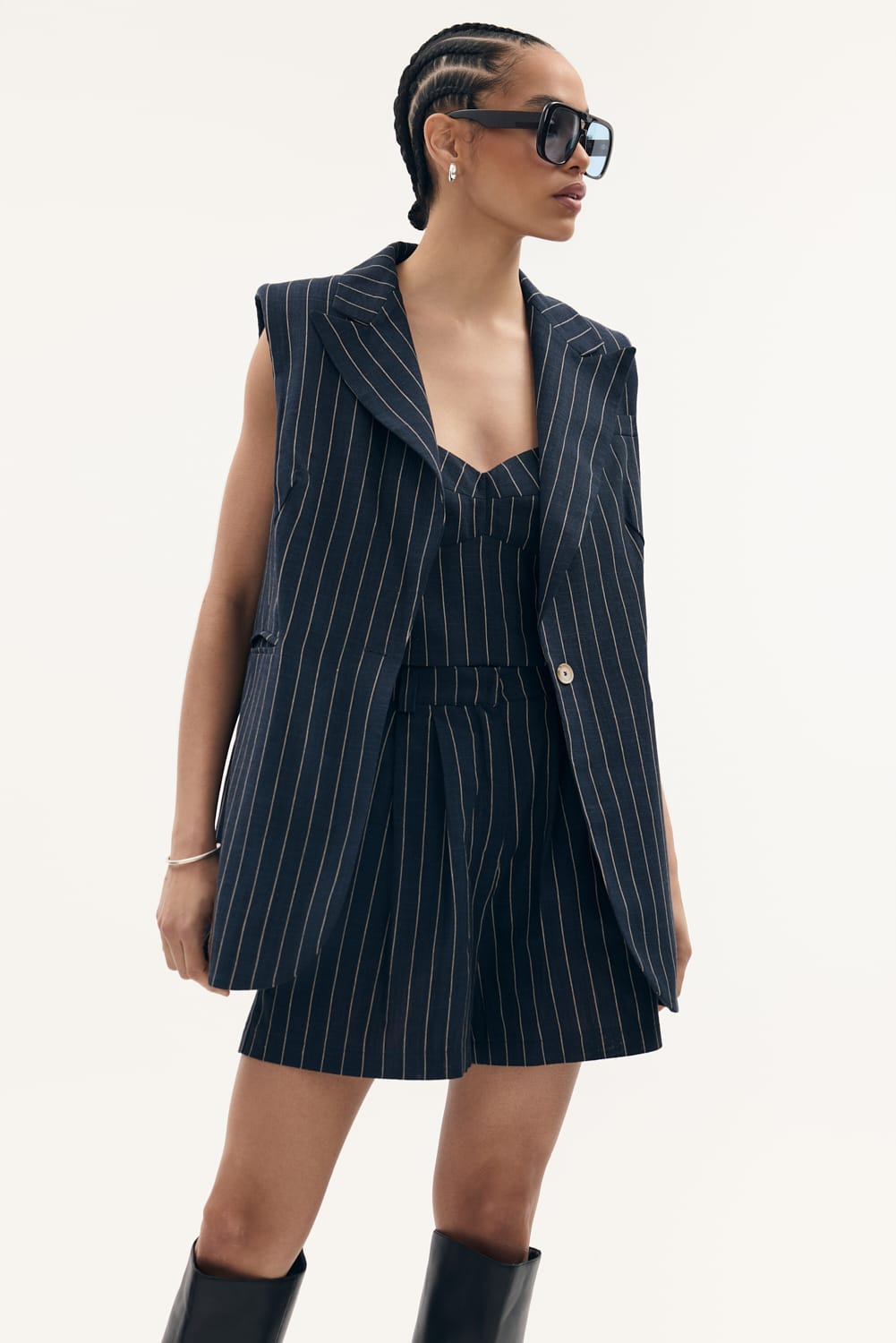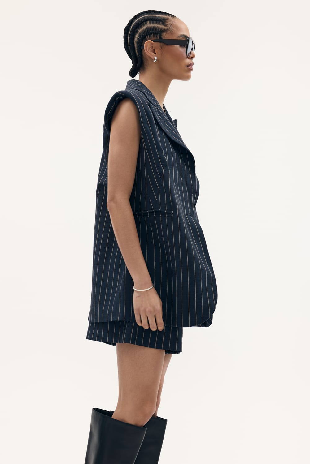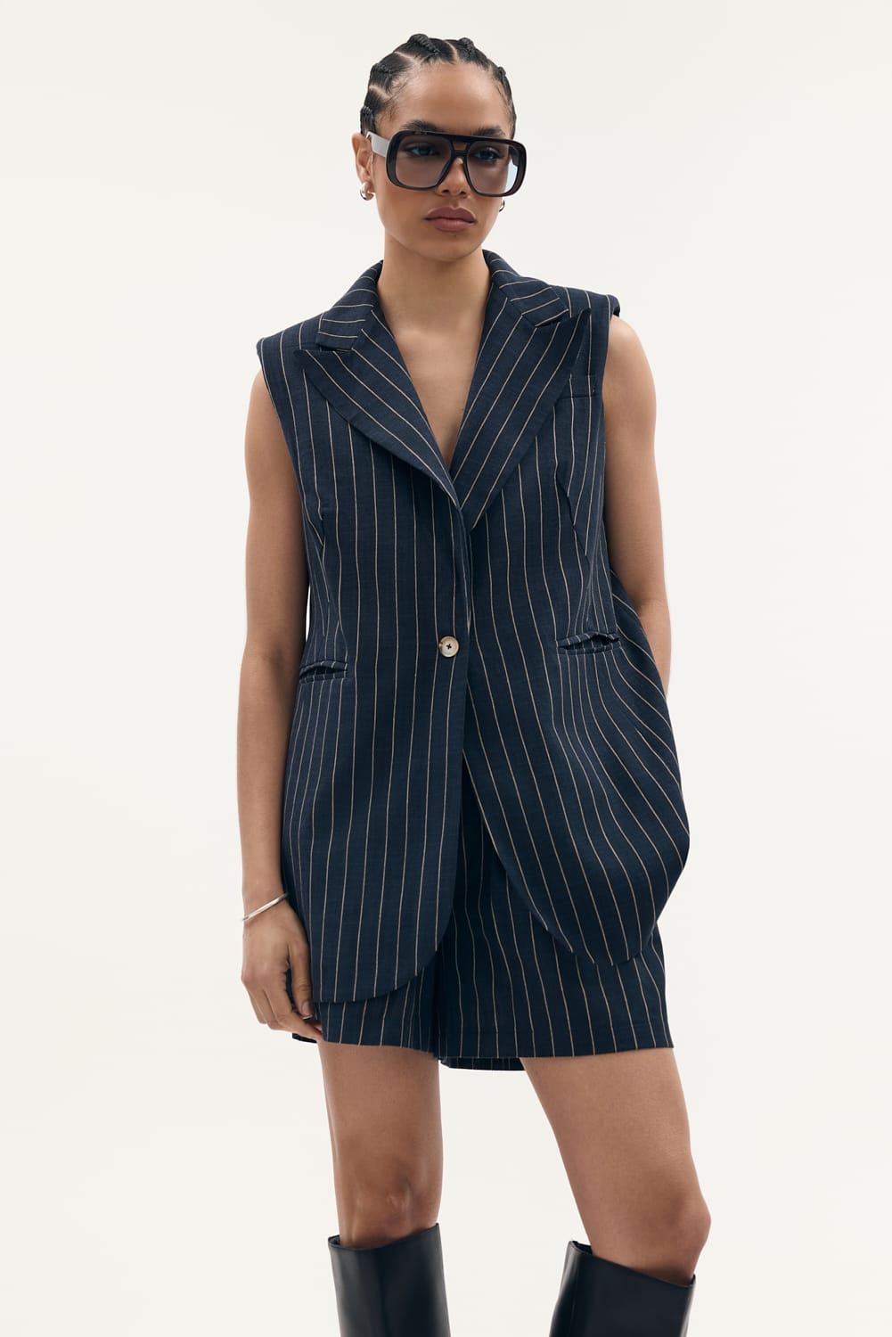 Długa kamizelka na podszewce z poduszkami na ramionach zapinana na guzik