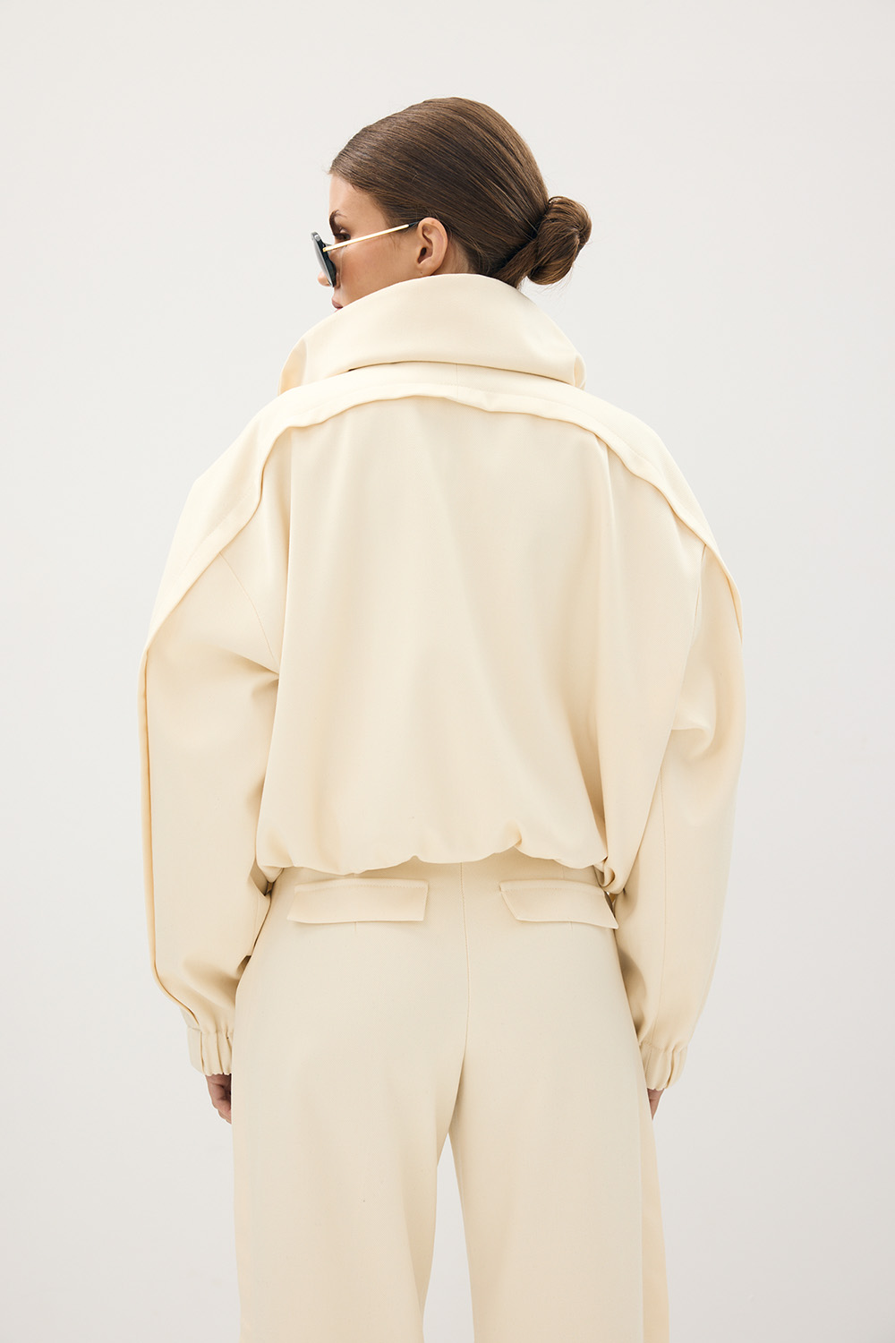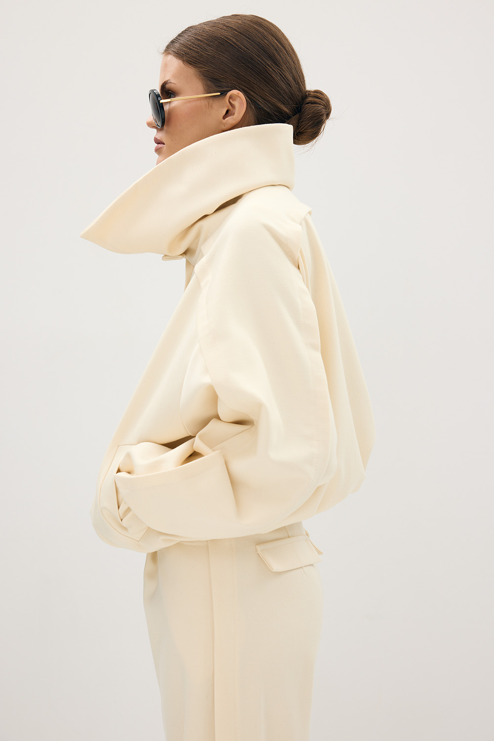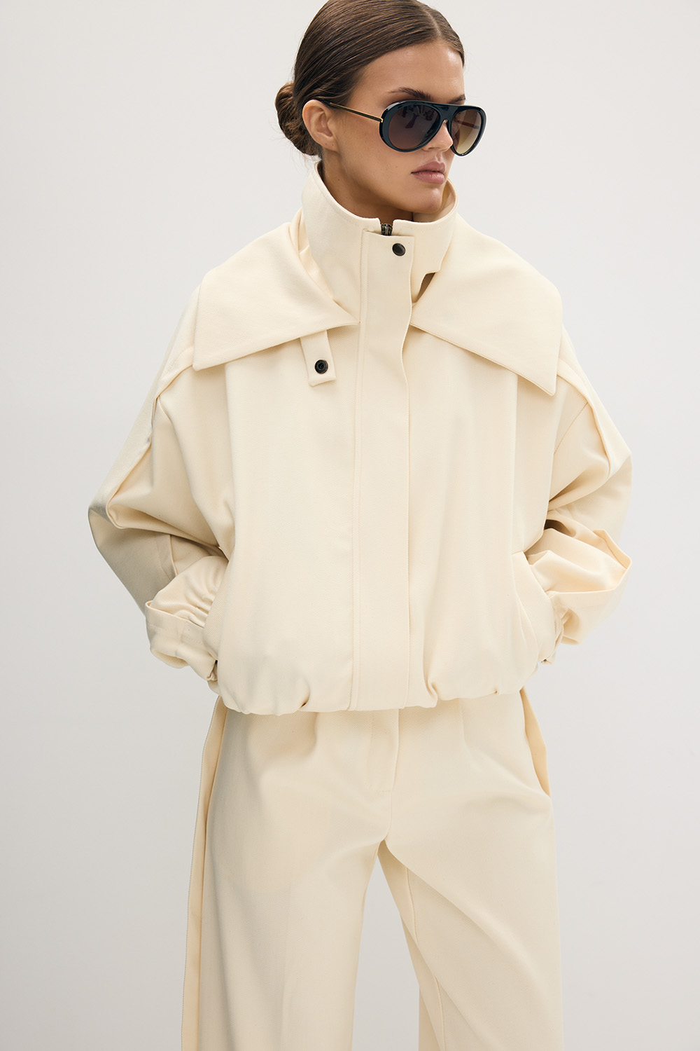 Kurtka Lara Cream to nowoczesna, minimalistyczna forma w subtelnym wydaniu. Charakterystyczny podwójny kołnierz, ściągacze na rękawach i u dołu oraz lekko oversize’owy krój nadają jej architektoniczny charakter z nutą sportowej elegancji. Wykonana z luksusowej mieszanki wełny (75%) i bawełny (25%), na wiskozowej podszewce, łączy miękkość, strukturę i wyjątkowy komfort noszenia.