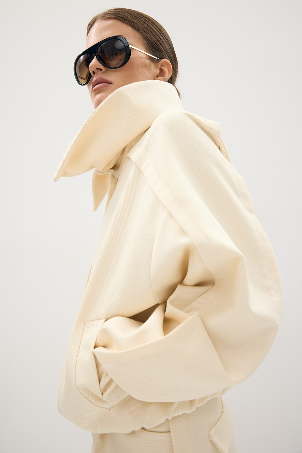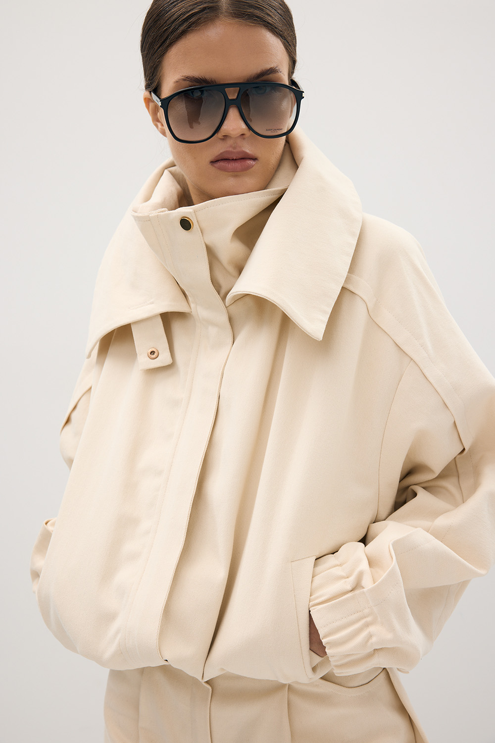- Krój: oversize, z podwójnym kołnierzem