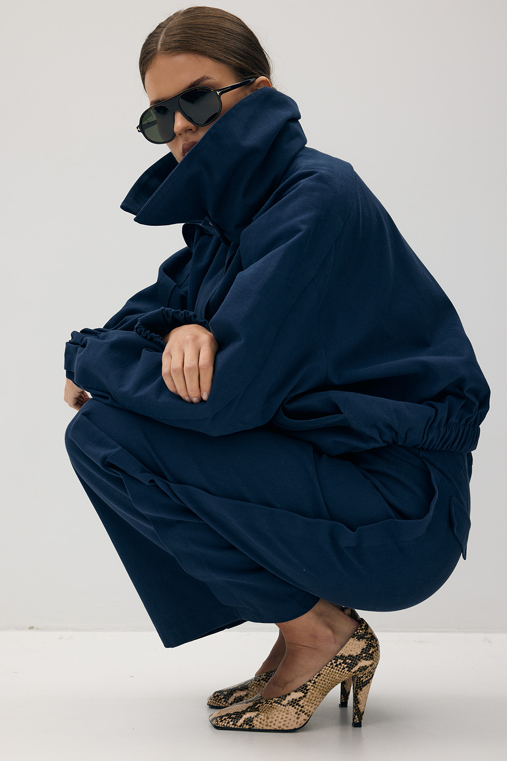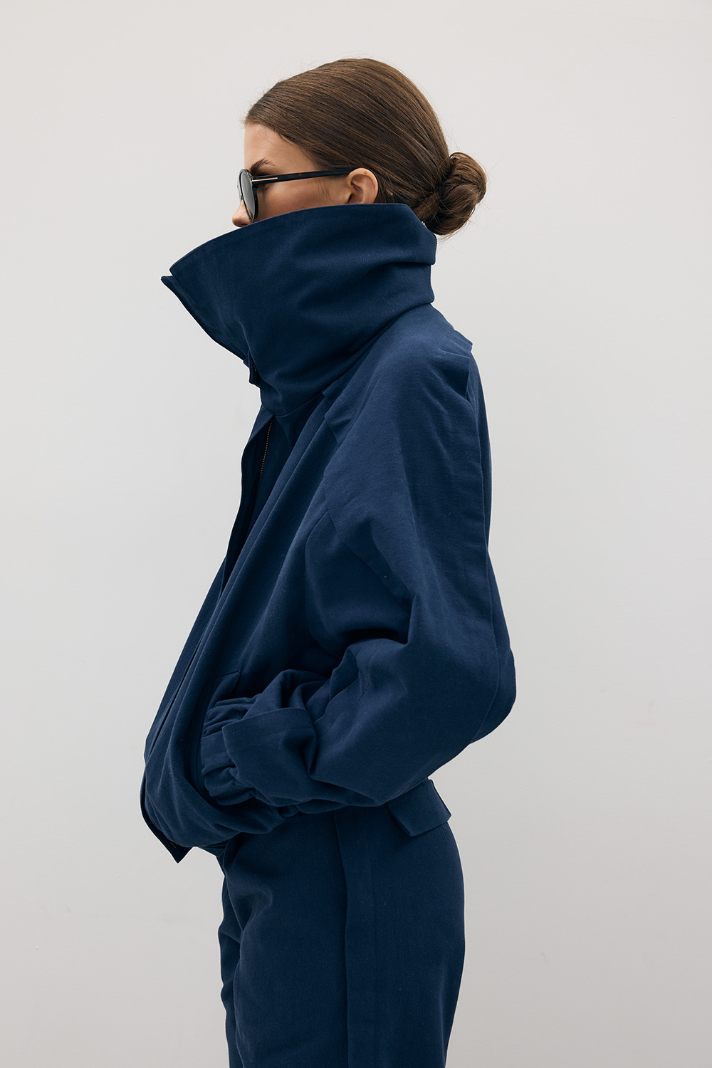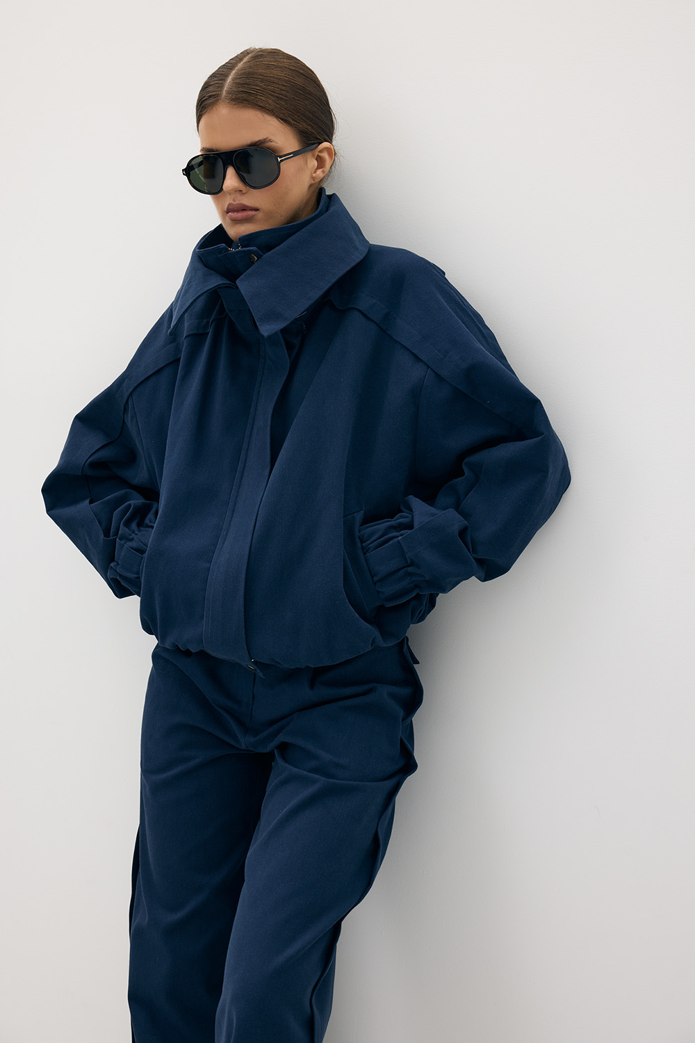 Architektoniczna linia oraz charakterystyczne detale — podwójny kołnierz, ściągacze i oversize’owy krój — nadają sylwetce współczesny, wyważony wyraz. Minimalistyczna, a zarazem wyrazista forma sprawia, że model doskonale odnajduje się w codziennych stylizacjach, zarówno w komplecie, jak i jako samodzielny element garderoby.