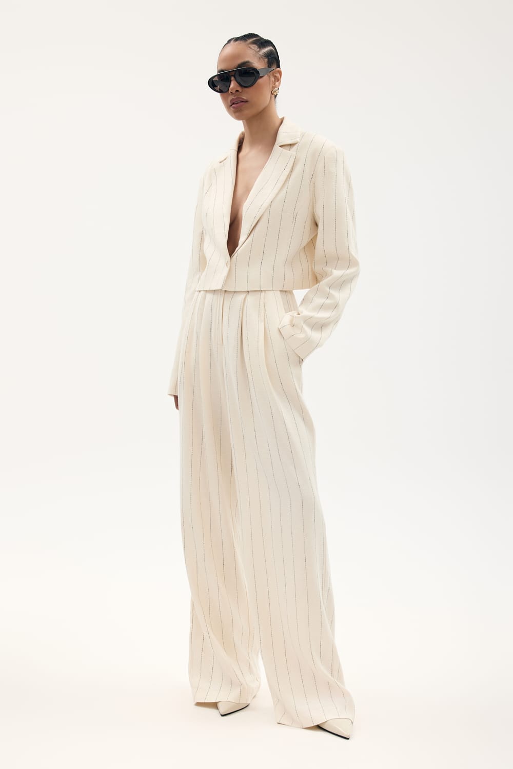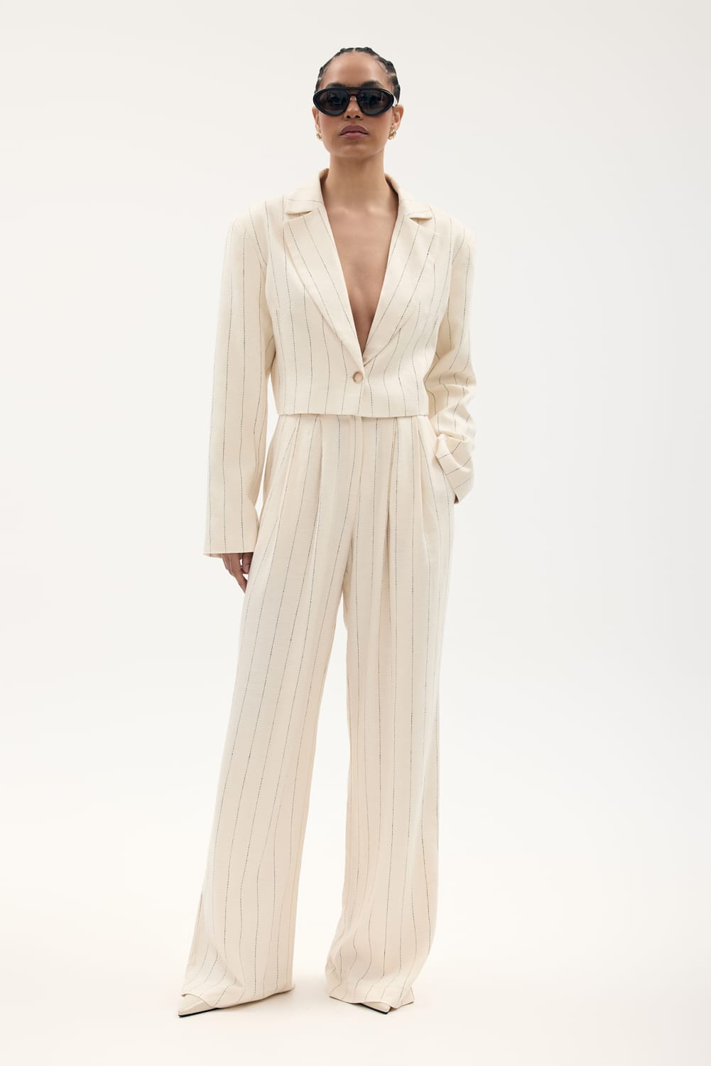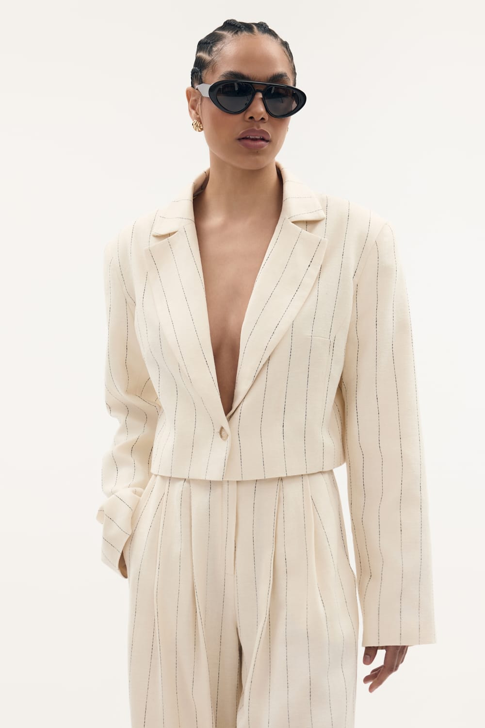 Krótki żakiet o lekko oversize’owym kroju, zapinany na guzik, wykończony elegancką podszewką oraz poduszkami w ramionach. Wykonany z ramii, która sprawdzi się w każdej porze roku. Doskonale łączy się ze spodeniami i kamizelka matin cream