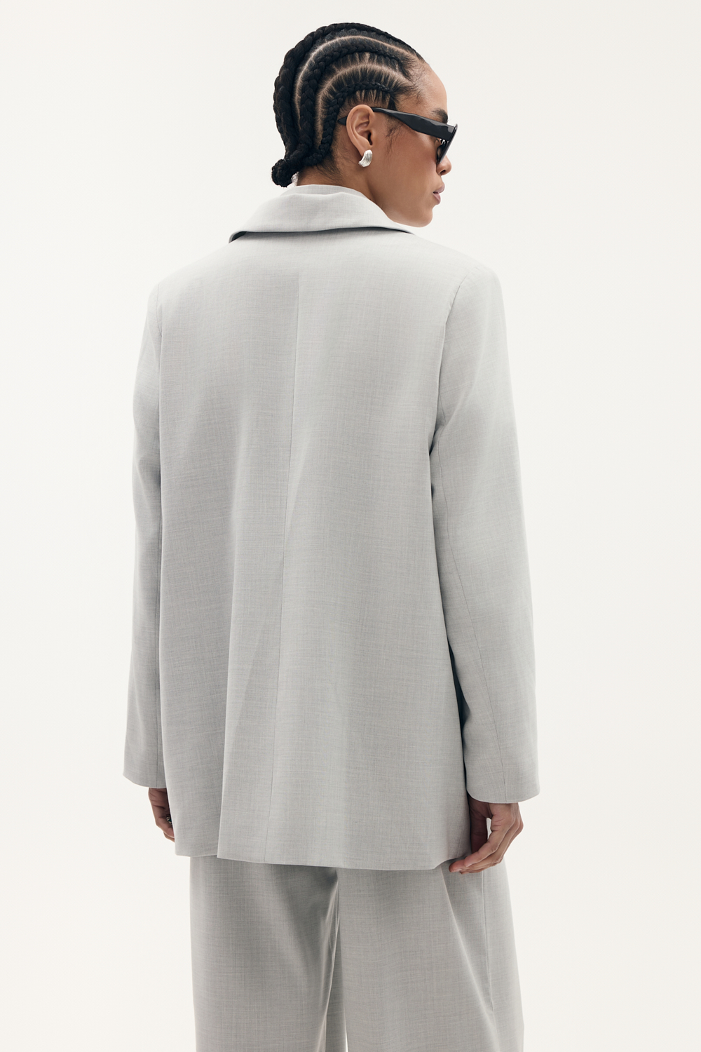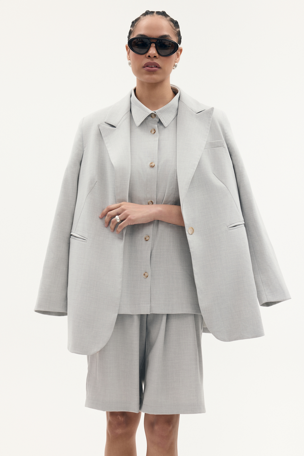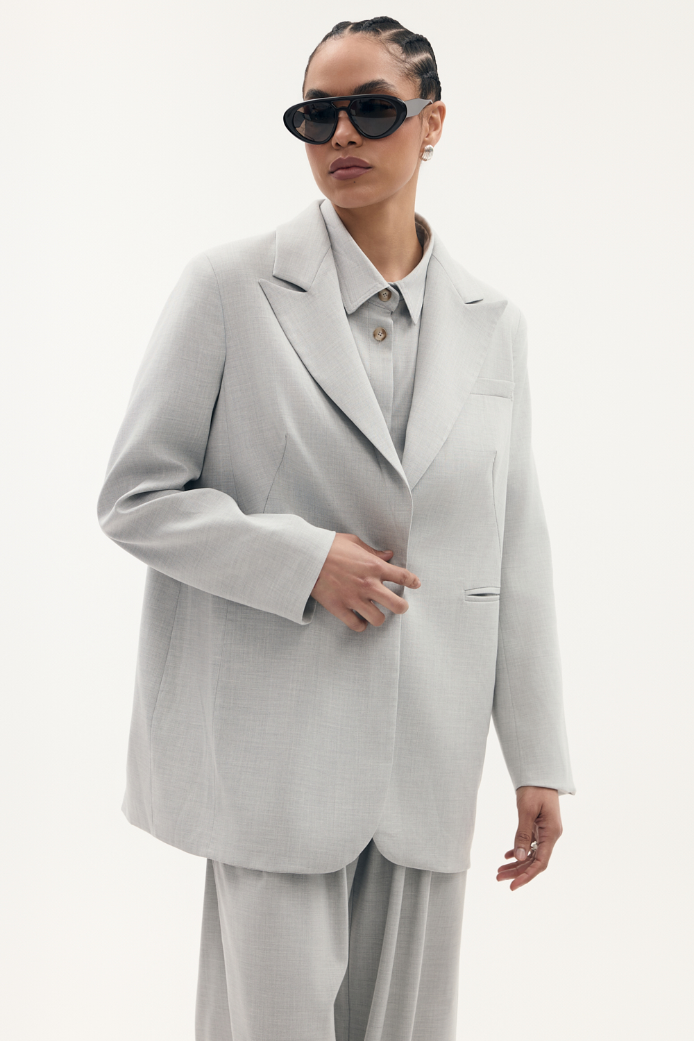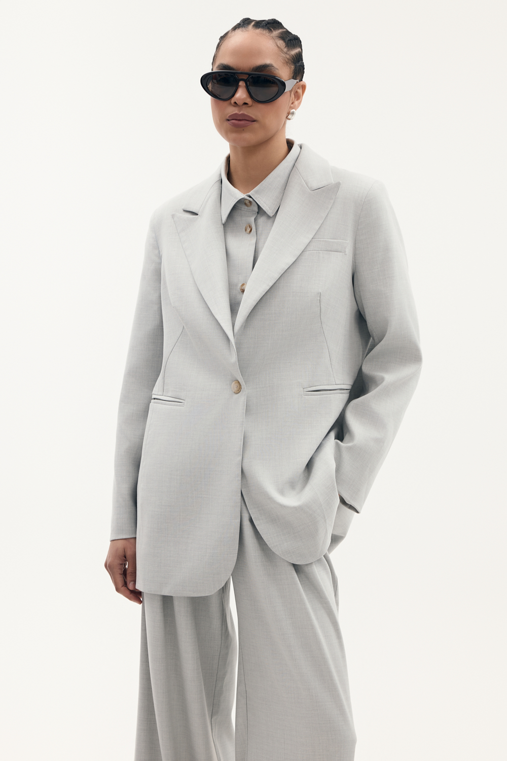 Długa marynarka o oversizowym kroju z ozdobnymi kieszeniami zapinana na guzik, wykonczona elegancka podszewka