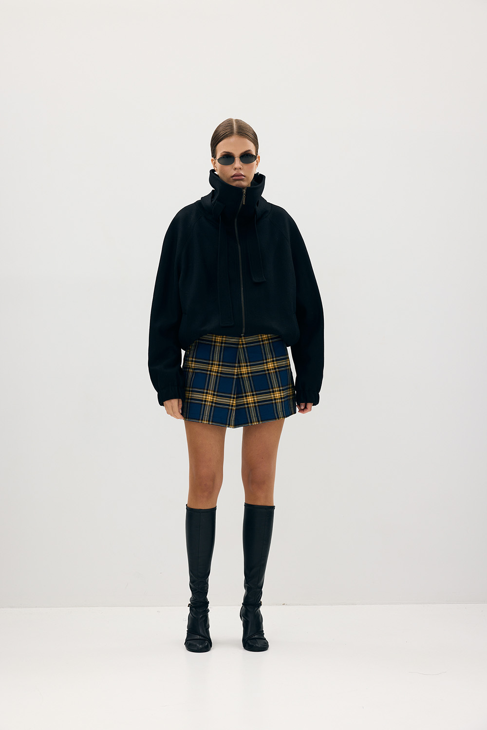 Spódnico-spodenki w kratę w odcieniach granatu, żółci i grafitu, wykonane z limitowanego stocku tkaniny Gucci z najwyższej jakości 100% bawełny. Strukturalny materiał o miękkim, naturalnym chwycie nadaje formie wyjątkową szlachetność i trwałość. Charakterystyczny krój łączy nowoczesną linię mini z funkcjonalnością spodenek, tworząc wyważoną sylwetkę o lekkim, architektonicznym charakterze. Skort Check Marine to wyjątkowy element kolekcji — połączenie klasyki i indywidualizmu, stworzony w krótkiej, limitowanej serii ILO PRIVE.