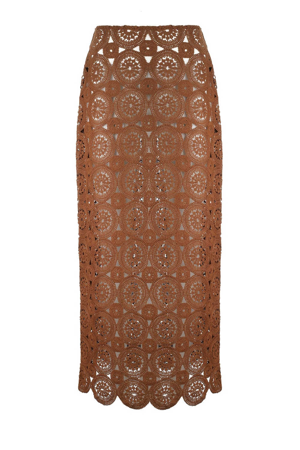 Długa spódnica z makramy bawełnianej, z efektownym bocznym rozcięciem i ozdobnym wykończeniem, z boku zapinana na zamek.