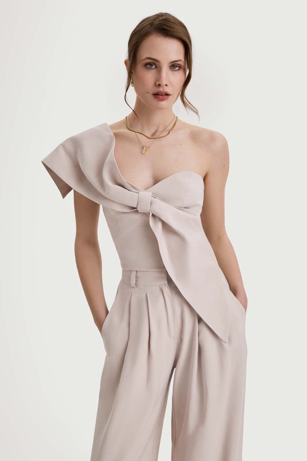 Spodnie o szerokiej, swobodnej linii, które budują wyrafinowaną sylwetkę. Wysoki stan podkreśla talię, a miękko układająca się tkanina nadaje całości lekkości i płynności ruchu. Tworzą spójny komplet z topem carla — razem definiują nowoczesną, elegancką formę na wieczór i na co dzień.