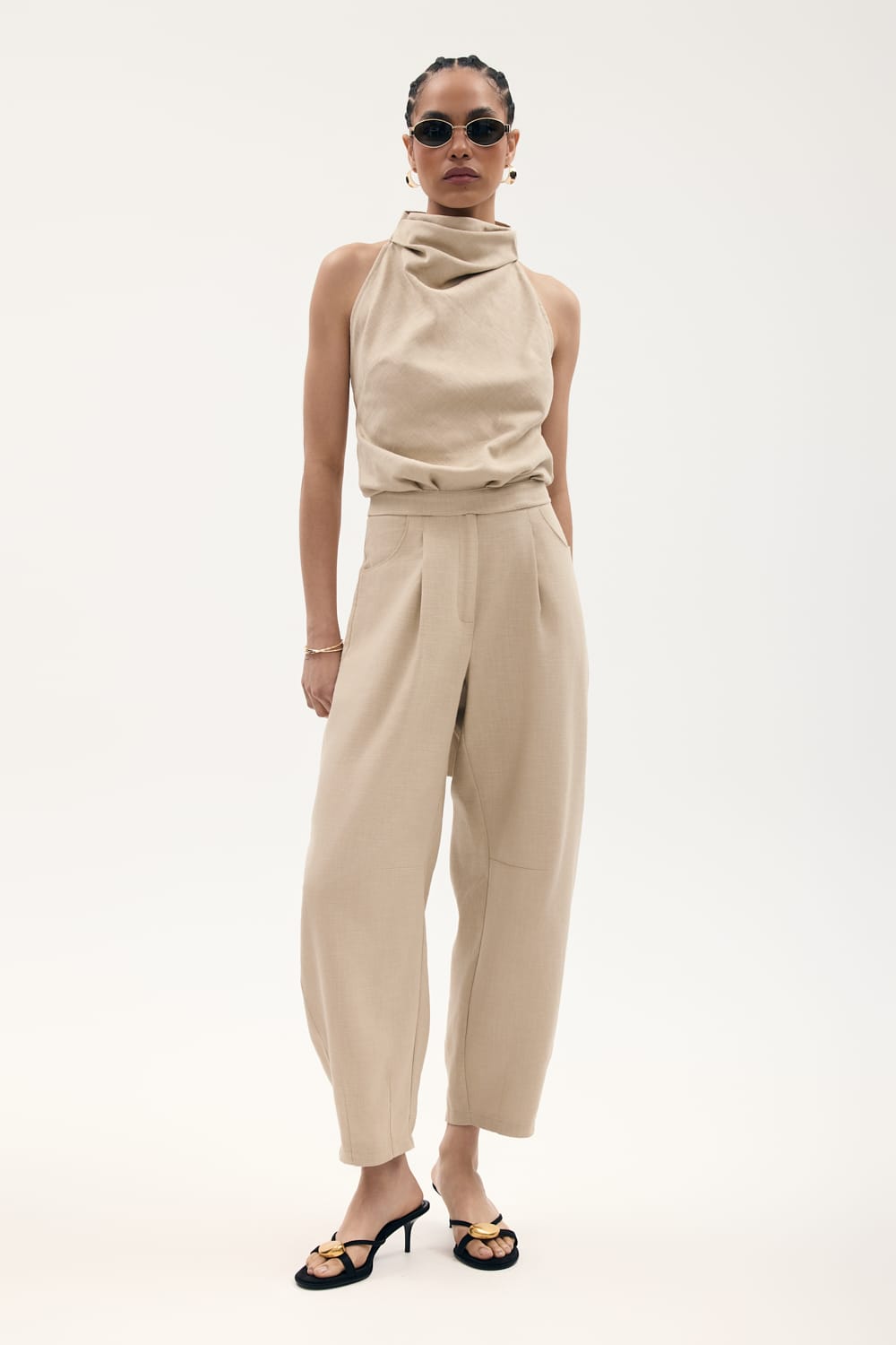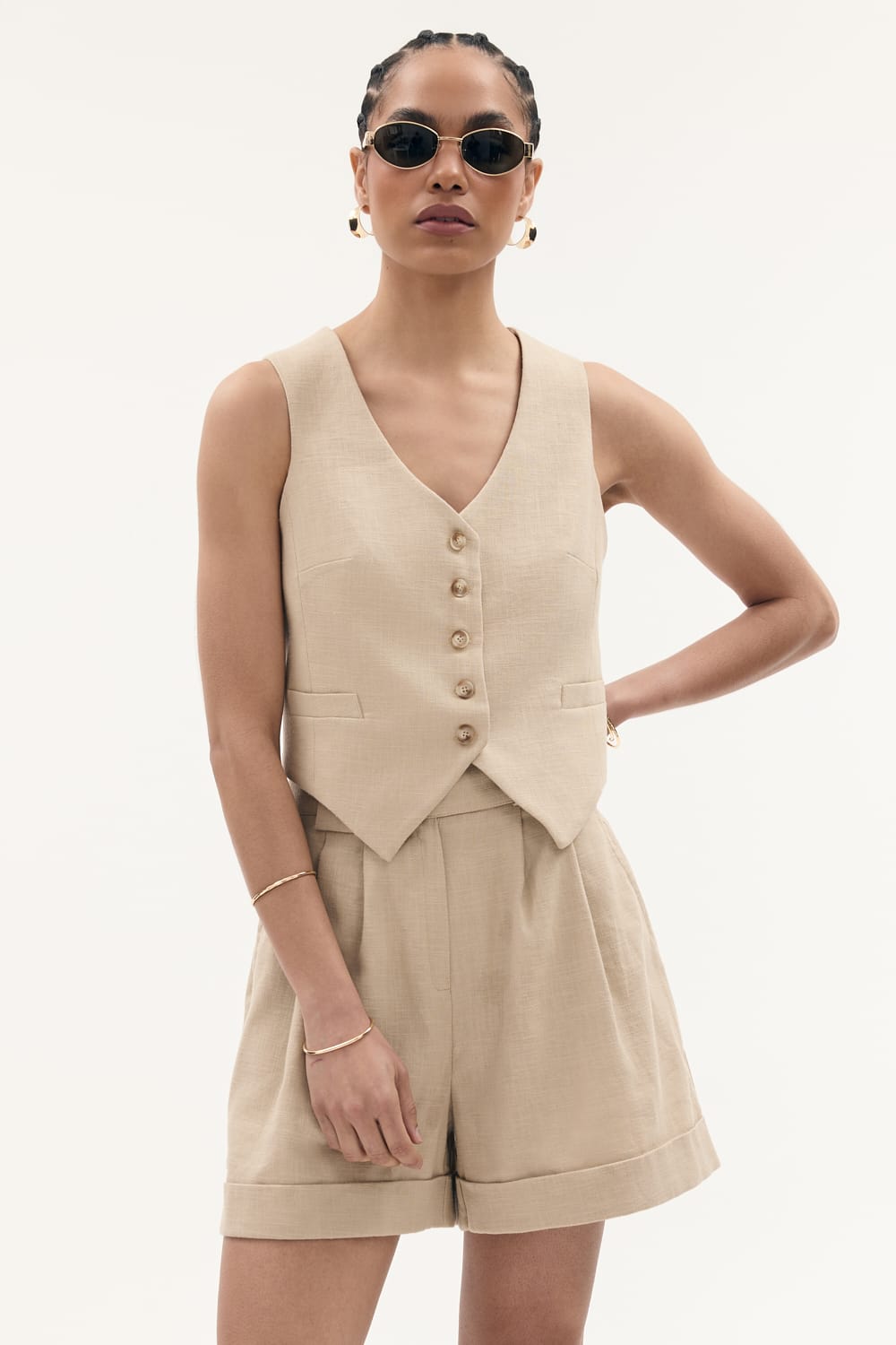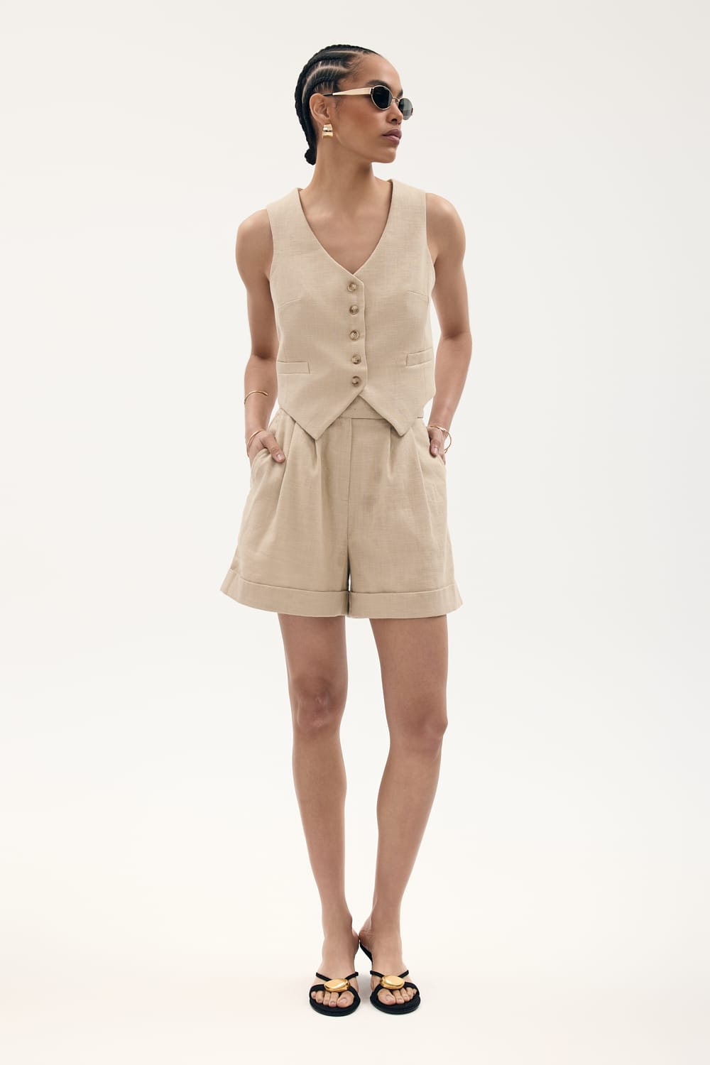 Krótkie spodnie o luźniej nogawce, z wysokim stanem, zapinane na haftkę dyskretnie ukrytą pod paskiem. Wspaniale komponują się z żakietem PARIS.