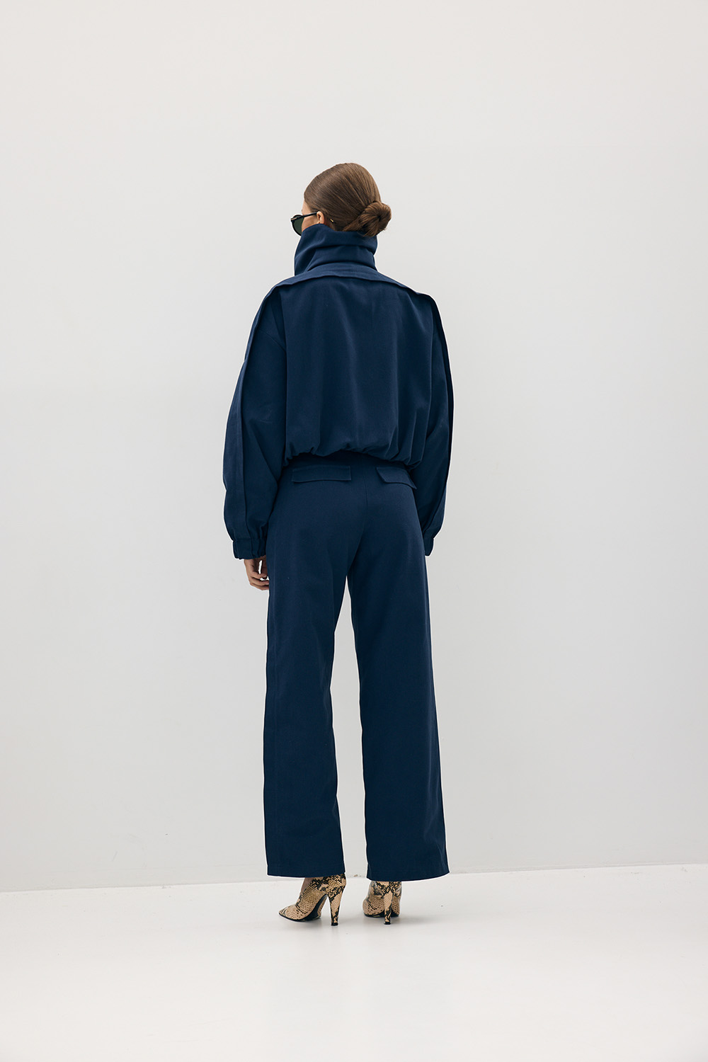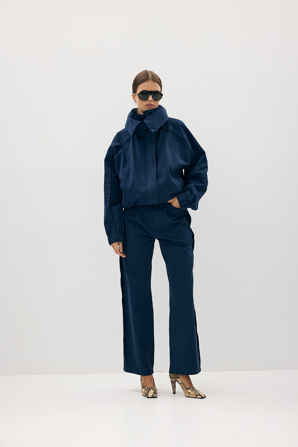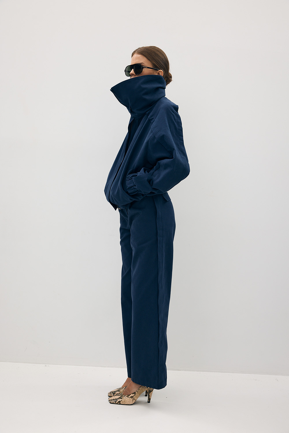 Spodnie Lara Denim w odcieniu granatowego denimu to współczesna interpretacja klasycznych spodni z szeroką nogawką. Wykonane z grubej, strukturalnej bawełny inspirowanej jeansową fakturą, zapewniają trwałość oraz wyraźnie zdefiniowaną formę, zachowując jednocześnie komfort noszenia.