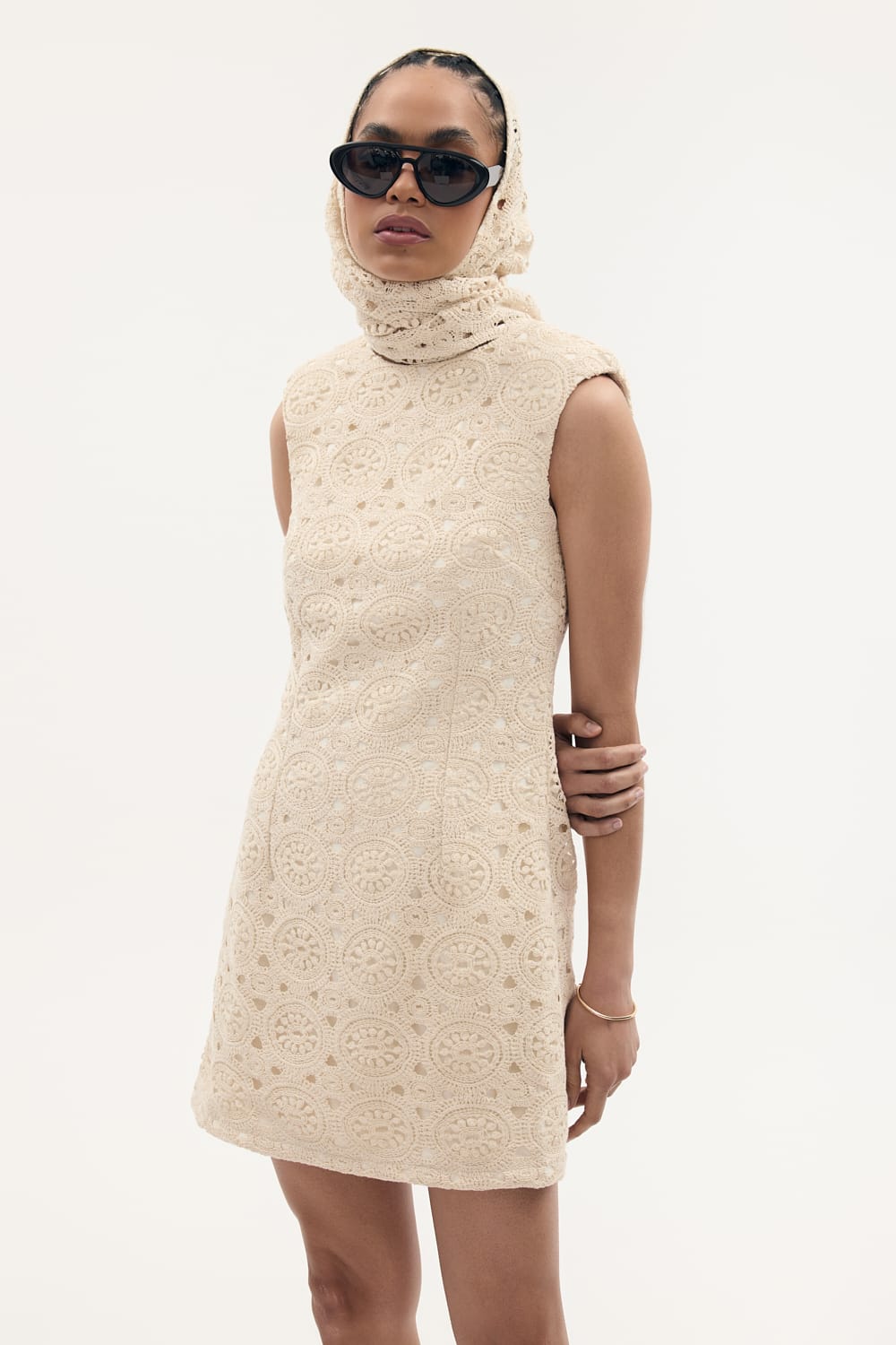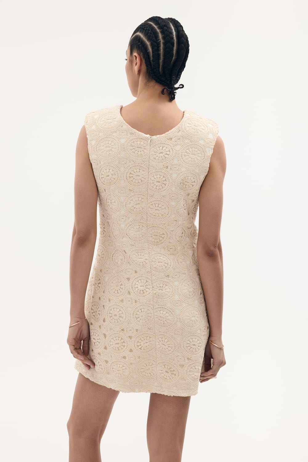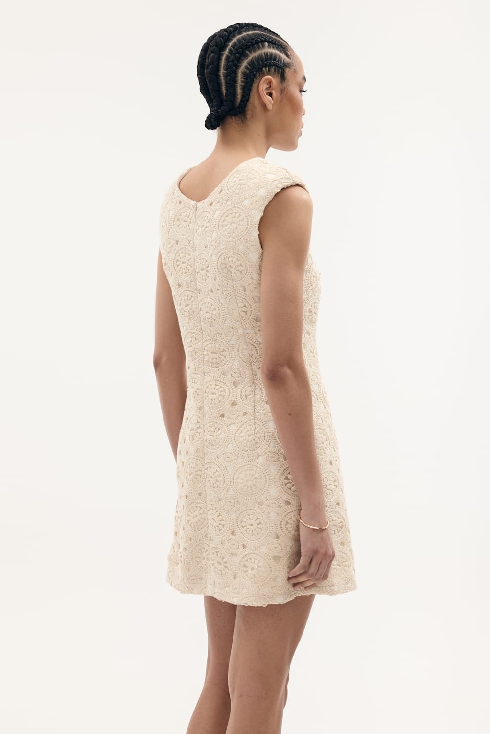 Sukienka z makramy o kroju babydoll w kolorze ecru, ma okrągły dekolt, poduszki na ramionach, jest delikatnie rozkloszowana, posiada podszewkę.