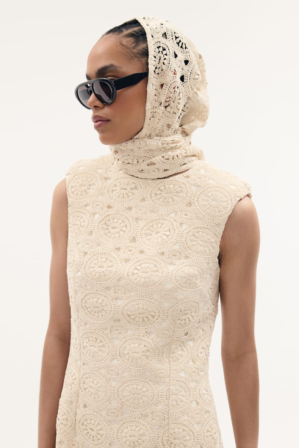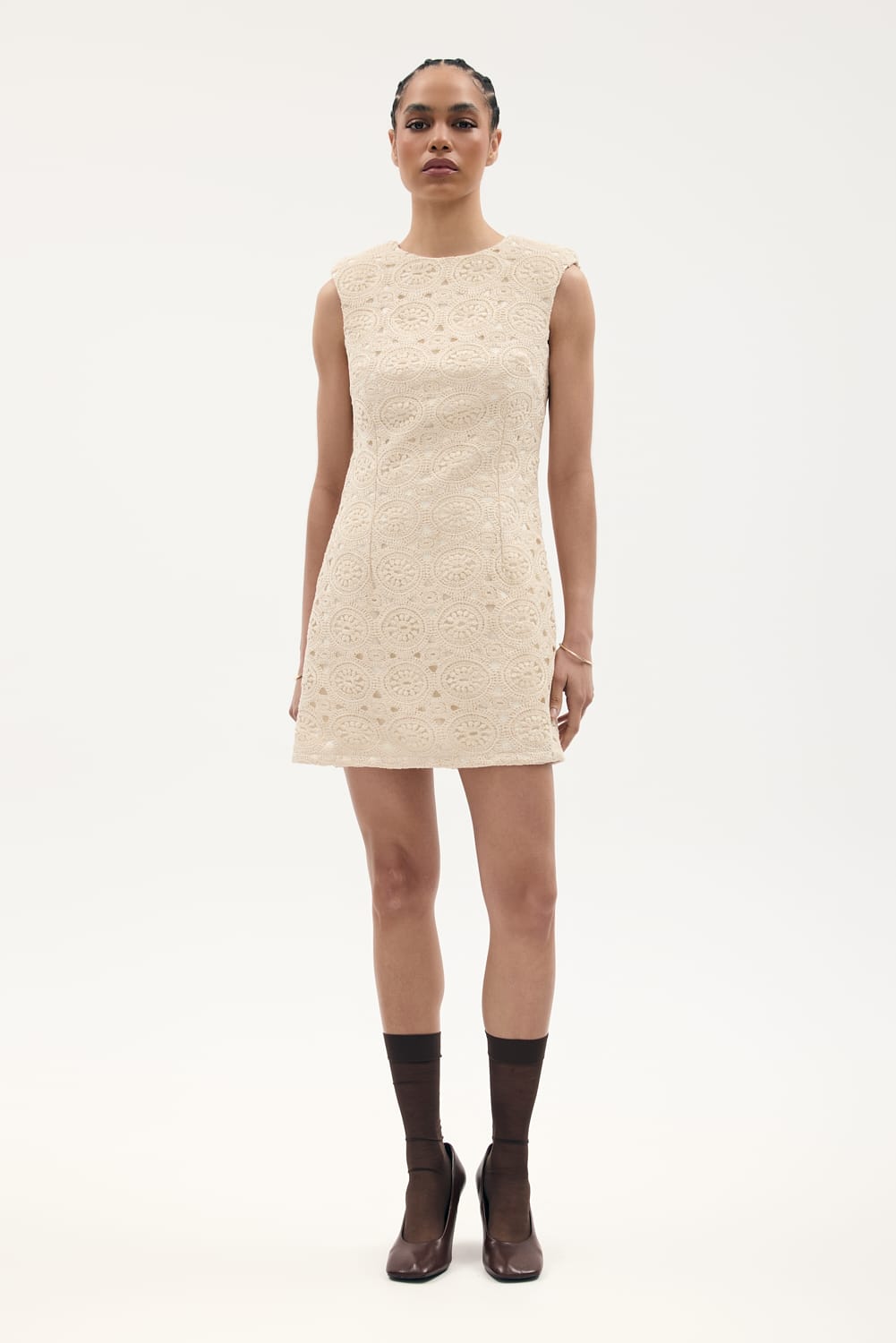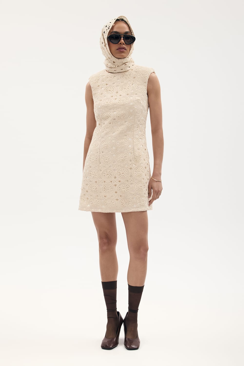 Sukienka z makramy o kroju babydoll w kolorze ecru, ma okrągły dekolt, poduszki na ramionach, jest delikatnie rozkloszowana, posiada podszewkę.