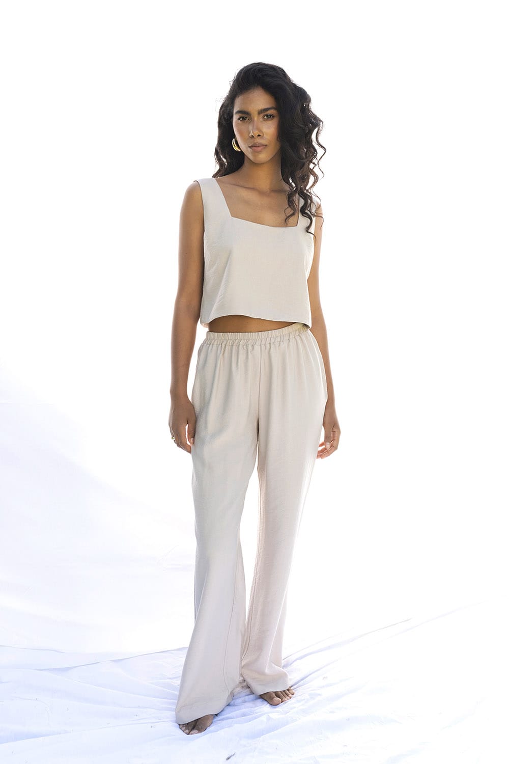 Krótki top w kolorze beżowym na szerokich ramiączkach uszyty z podwójnej warstwy tkaniny